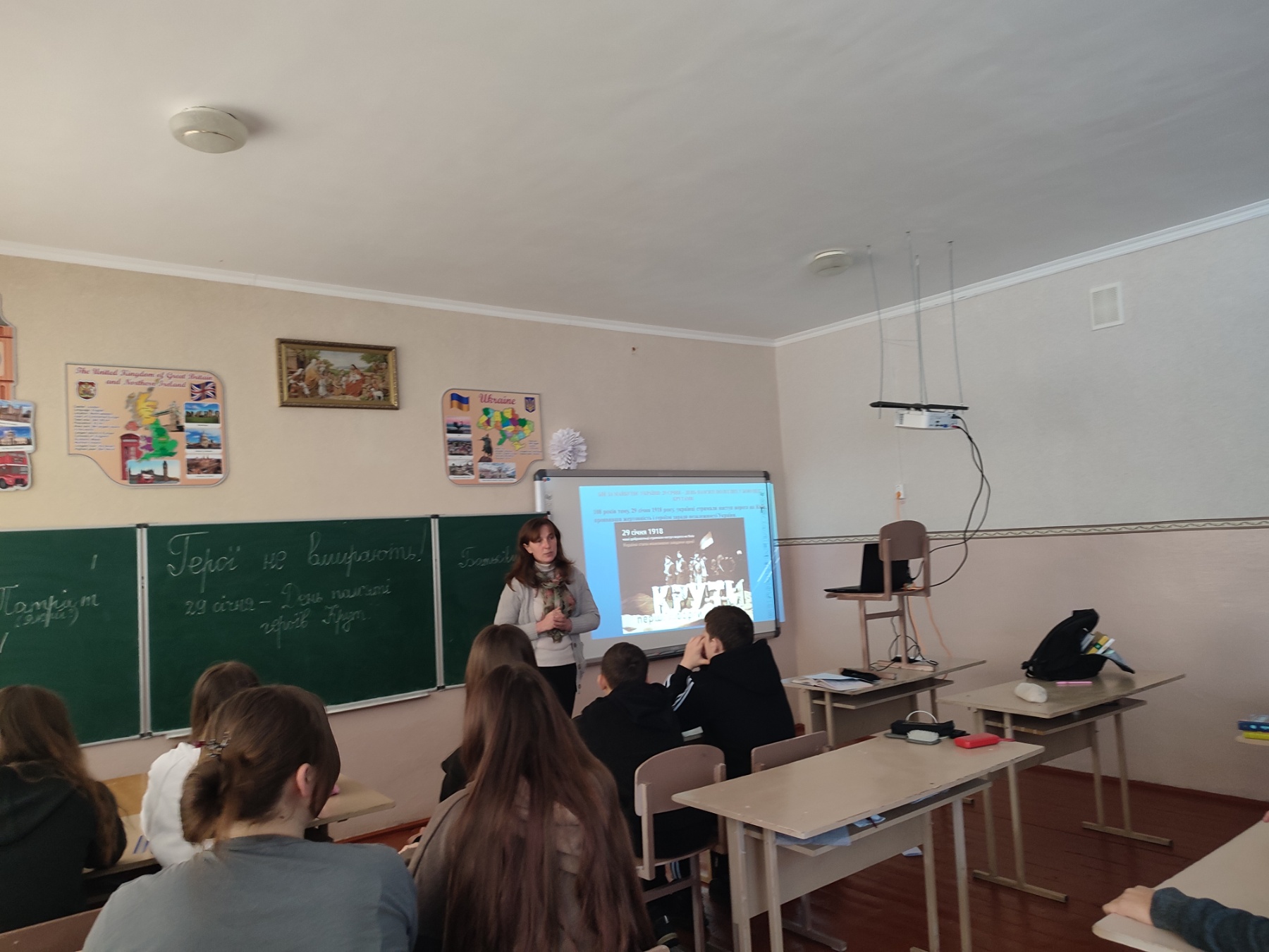 Учні вшанували пам'ять загиблих героїв хвилиною мовчання . Класний керівник 8 класу Осадчук Л.А. провела урок мужності «Крути : історія української незламності».